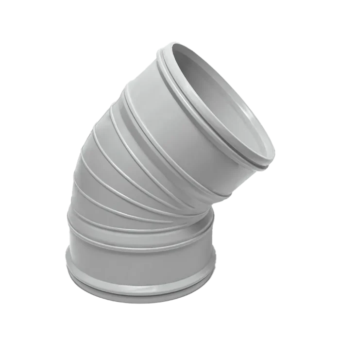 - جلوگیری از افت فشار و گرفتگی: زانوهای ۴۵ درجه مسیر جریان را نرم تر و تدریجی تر تغییر میدهند، بنابراین جریان آب یا فاضلاب راحت تر عبور کرده و احتمال گرفتگی کمتر میشود.